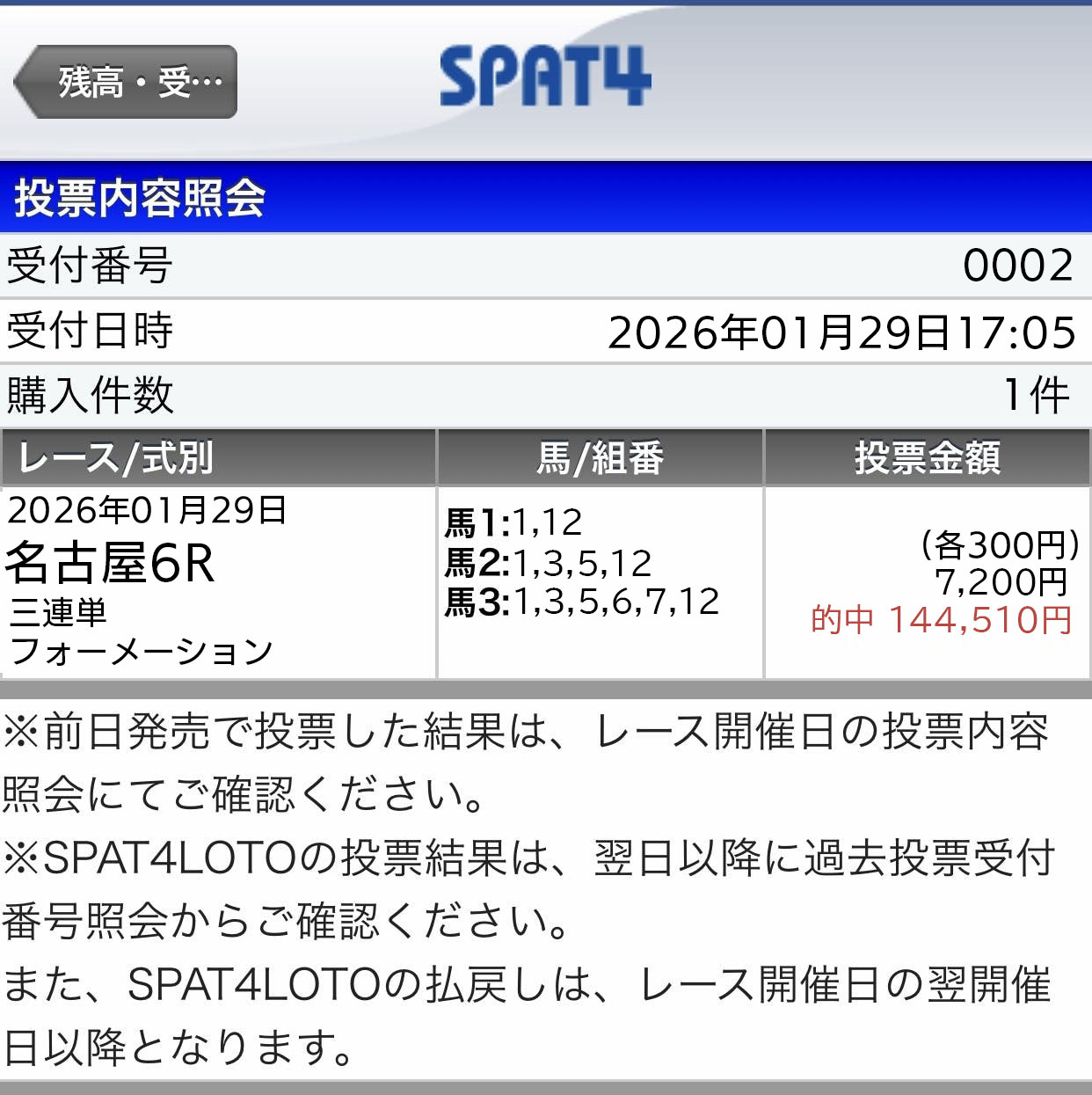 珍しく3連単買い目じゃなくて3連複買い目だったから配当狙いにいってるのかな?って少し考えちゃったけど、レース後、そうだったのねと納得! 3連単100万馬券的中なんて買い目点数何点あっても足りないからね、無難に3連複を獲りに行ったのが分かる買い目で納得! ワイドですら万馬券付いた荒れたレースで63万7160円払戻し。 3連複で初の高額払戻し達成できました。