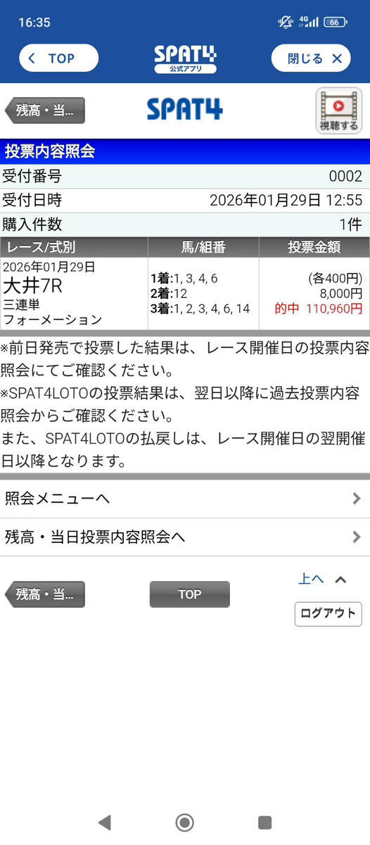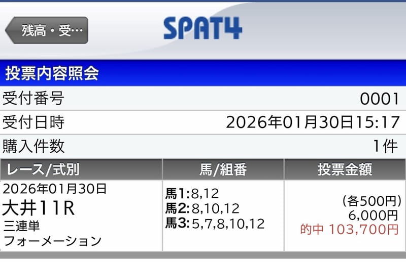 6千円の馬券代が10万越え、立派な成績だと、考えています。 継続は、力なり、今週も地方競馬、利用させてもらいます。