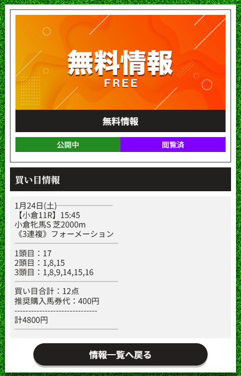 今日初めて登録してサイト内色々見てたけど、先週の中央無料予想で36万払い戻しだと?! もっと早く気付いてもっと早く利用していればよかったとマジで2026年一発目の後悔… 過去口コミもかなり当たっているし期待持てそう!