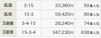 3連複万馬券282.4倍的中、1番人気と2番人気が吹っ飛んだから3連単もエグイ配当。